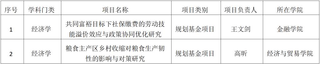 近日,教育部社科司发布《关于2025年度教育部人文社会科学研究一般项目立项的通知》,我校立项教育部人文社科一般项目2项,分别是金融学院王文剑院长主持的《共同富裕目标下社保缴费的劳动技能溢价效应与政策协同优化研究》,经济与贸易学院高昕博士主持的《粮食主产区乡村收缩对粮食生产韧性的影响与对策研究》。